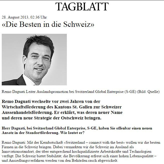 «Die Besten in die Schweiz»Remo Daguati, CEO LOC AG28. Aug. 20131 Min. Lesezeit Remo Daguati wechselte vor zwei Jahren von der Wirtschaftsförderung des Kantons St. Gallen zur Schweizer Aussenhandelsförderung. Er erklärt, was deren neuer Name und deren neue Strategie der Ostschweiz bringen. Hier geht es zum ganzen Artikel http://www.tagblatt.ch/aktuell/wirtschaft/tb-wo/Die-Besten-in-die-Schweiz;art123834,3515679